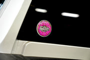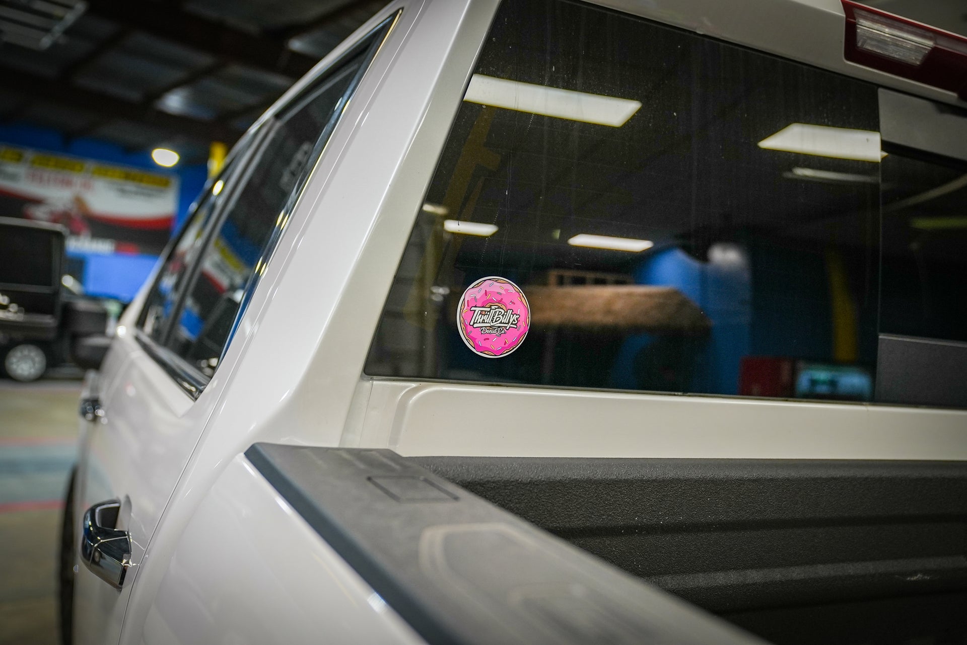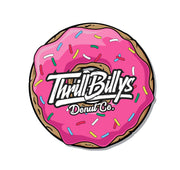 The ThrillBilly Donut Co. 4-inch sticker features a bright pink donut absolutely smothered in sprinkles — because nothing says “I make bad decisions proudly” like slapping pastry art on your vehicle.